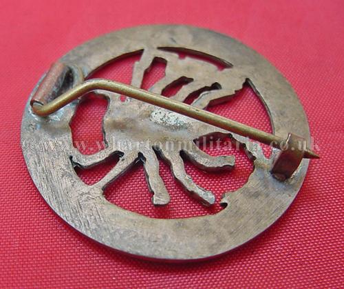 WW2 Long Range Desert Group cap badge, first style without the raised rims, unusually fitted with a pin - there are no signs of having had lugs previously though the pin could be positioned over such, the pin is well fitted, some signs of wear but in very good condition, a scare badge to find as an original period example, especially with a brooch pin.