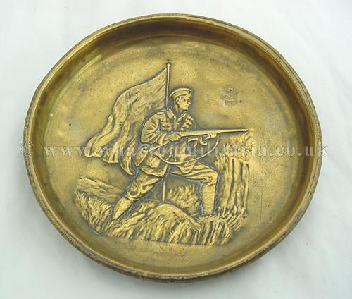 A fine WW1 patriotic brass ashtray showing a soldier surging forward, flag flying etc. Very typical of these early commemorative pieces, in excellent condition, approx 5 inches diameter. A nice item.