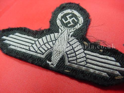 An excellent quality reproduction SS cap eagle, German made bevo style, being reproduced off an original bevo machine and pattern, a very presentable cap eagle.