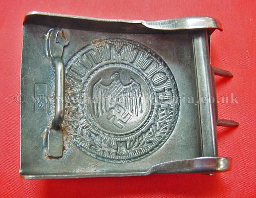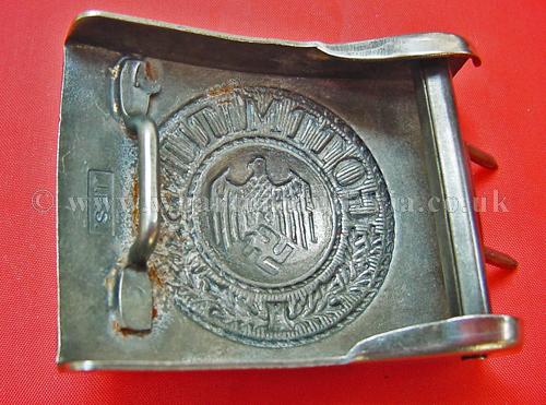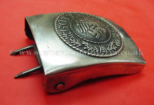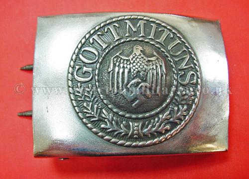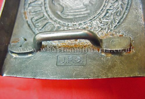 A Wehrmacht steel belt buckle in excellent condition, maker marked 'J.F.S.', good detail with minimal wear, nice looking buckle but sold as a reproduction.