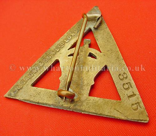 WW1 munition workers service badge, has individual issue number and makers details for Gaunt to the reverse. Has king's crown and date "1916" on a tablet to the centre, triangle edge bearing "On War Service ".