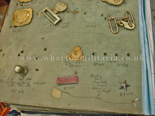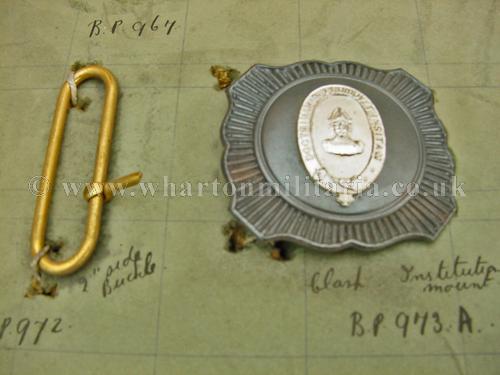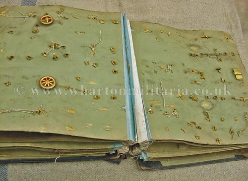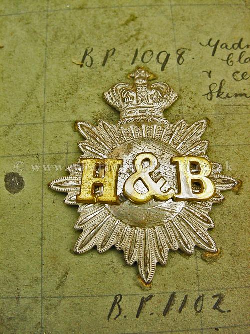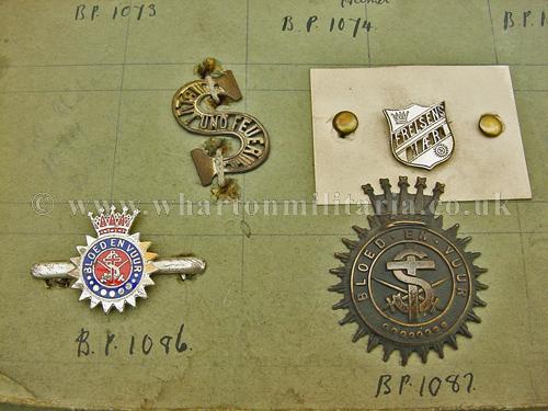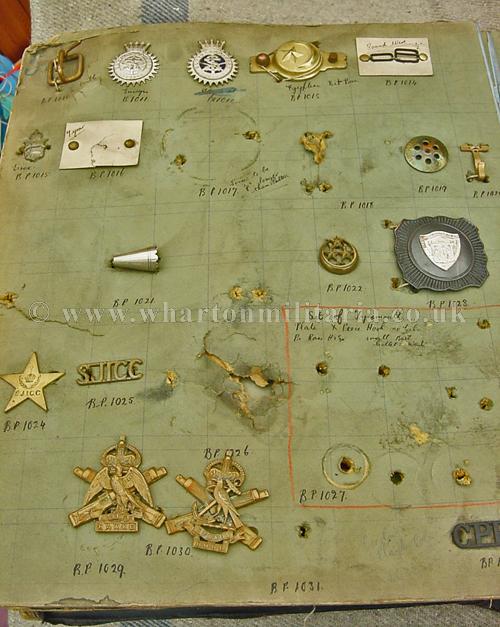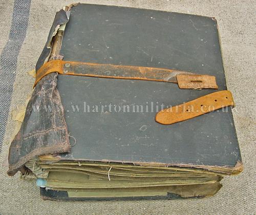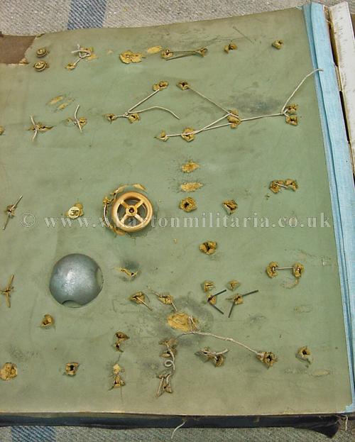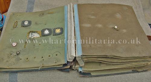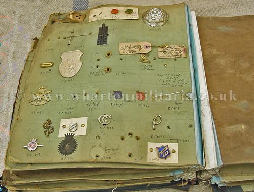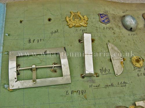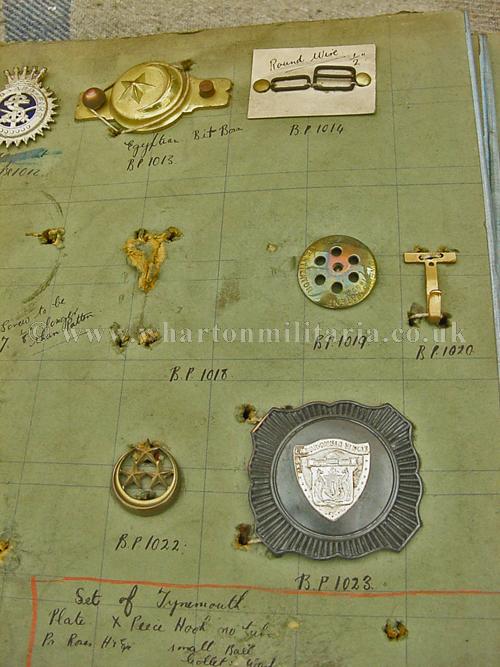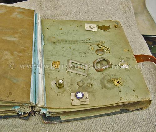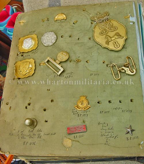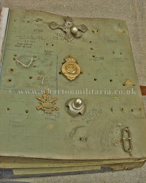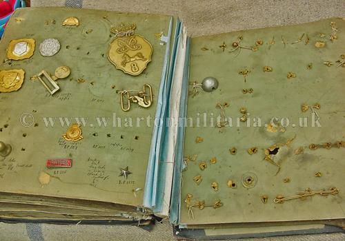 A very scarce Gaunt pattern book, book cover dated 1926 though some of the badges are clearly WW1, there are some military, Salvation Army, Scottish Clans, Police and a number of foreign items, there are badges, helmet parts, fittings, belt parts, quite a wide range of items were secured inside, book is not in good shape, holes have been cut to allow helmet tops to go between pages, really interesting and something quite different, can't be many of these survived.