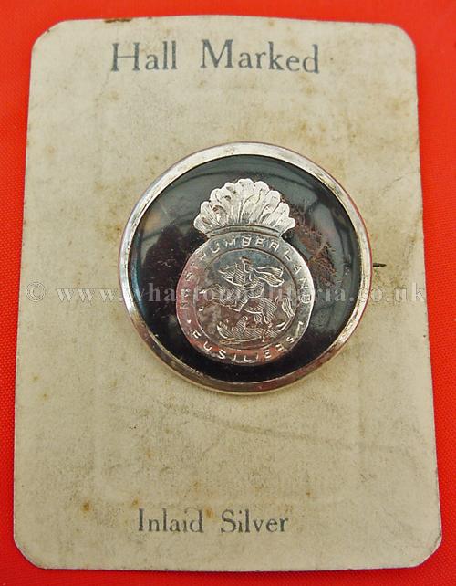 A scarce First World War period Northumberland Fusiliers silver and tortoiseshell sweetheart brooch still on its original makers card. Silver regimental badge inlaid in tortiseshell with rolled silver frame, frame is hallmarked 'FRG' for FR Baldwin and Birmingham Assay dated 1918. Beautiful unmarked brooch that has not seen the light of day since they were made, original pin and hook fittings, completely undamaged. Scarce and sought after sweetheart brooch especially in such unused mint condition. Diameter of badge 30mm.