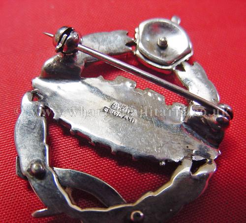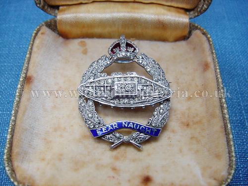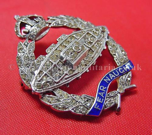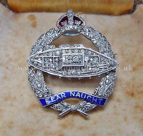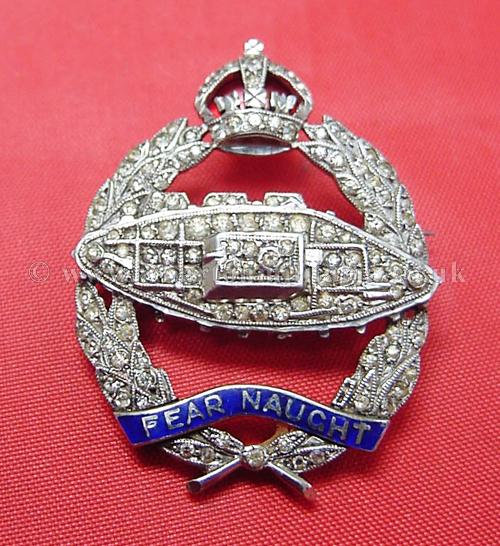 An exceptionally fine quality silver and paste 'diamonds' sweetheart to the Royal Tank Regiment, circ 1930s-40s, within its jewellers brooch case, Kings Crown, brooch pin, marked 'SCP England' solid silver, approx 7gm including the brooch pin, has been tested and guaranteed - approx 35x28mm. Lovely sweetheart with some fine enamel work to the crown and motto. Jewellers luxury fitted case is in excellent condition, jewellers details are marked as 'Ciro on Bond Sreet, London and New York'. A very fine RTR sweetheart brooch.