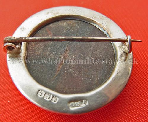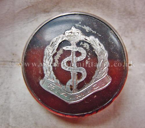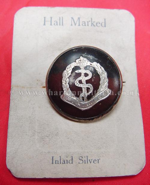 A scarce First World War period Royal Army Medical Corps silver and tortoiseshell sweetheart brooch still on its original makers card. Silver regimental badge inlaid in tortiseshell with rolled silver frame, frame is hallmarked 'FRG' for FR Baldwin and Birmingham Assay dated 1918. Beautiful brooch, a couple of hairline scratches, left side rolled edge slightly away from tortoiseshell, original pin and hook fittings. Scarce and sought after sweetheart brooch especially in such lovely mint condition. Diameter of badge 30mm.