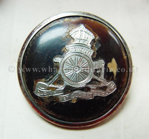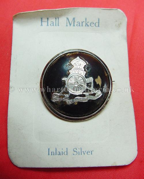 A scarce First World War period Royal Artillery silver and tortoiseshell sweetheart brooch still on its original makers card. Silver regimental badge inlaid in tortiseshell with rolled silver frame, frame is hallmarked 'FRG' for FR Baldwin and Birmingham Assay dated 1918. Beautiful unmarked brooch that has not seen the light of day since they were made, original pin and hook fittings, completely undamaged. Scarce and sought after sweetheart brooch especially in such unused mint condition. Diameter of badge 30mm.