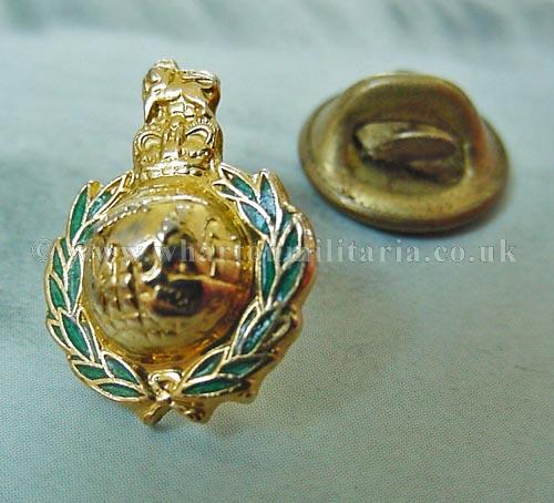 Royal Marines association or sweetheart pin badge circ 1980-90s, excellent condition, enamel and gilt metal on pin back, approx 15x10mm, clutch maker marked 'Ballou'. A very nice Royal Marines pin back badge.