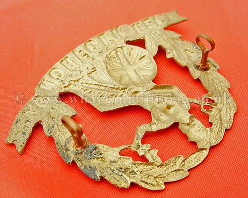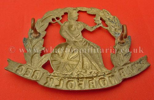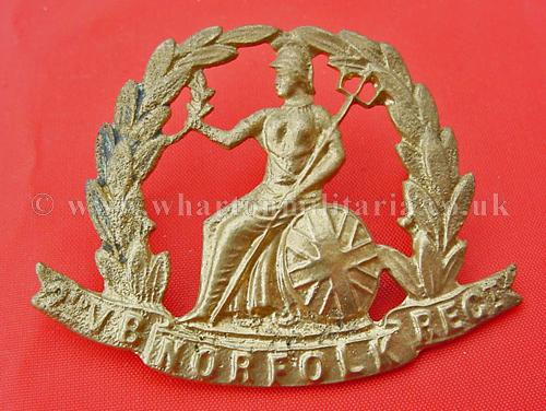 Scare WW1 2nd Volunteer Battalion Norfolk Regimental, all brass economy issue cap badge, both lugs intact, excellent condition