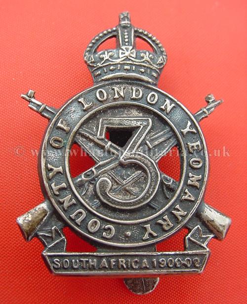 A very scarce solid silver (tested) cap badge to the 3rd County of London Yeomanry, excellent condition and patina, very little wear, slider marked 'silver' along with some maker type marks - 3 shields and a star - lovely badge not often found in silver, most likely a private purchase from a London Jeweller.