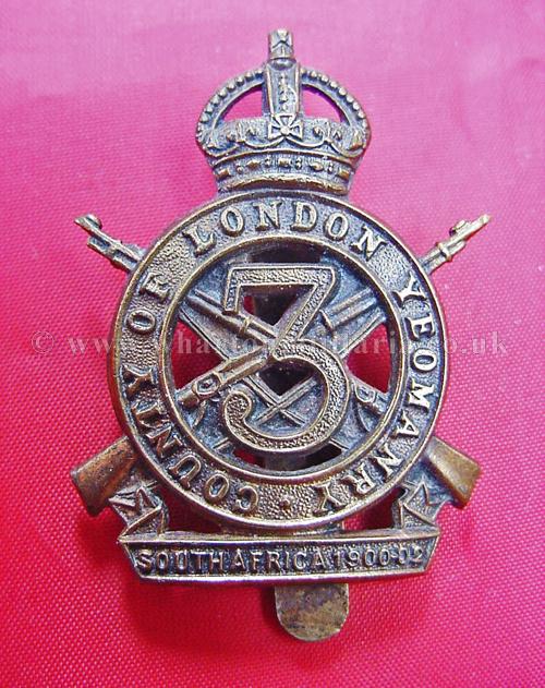 A scarce cap badge to the 3rd County of London Imperial Yeomanry, sharpshooters, excellent condition.