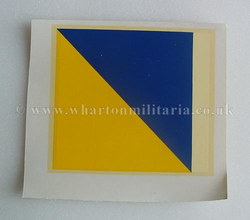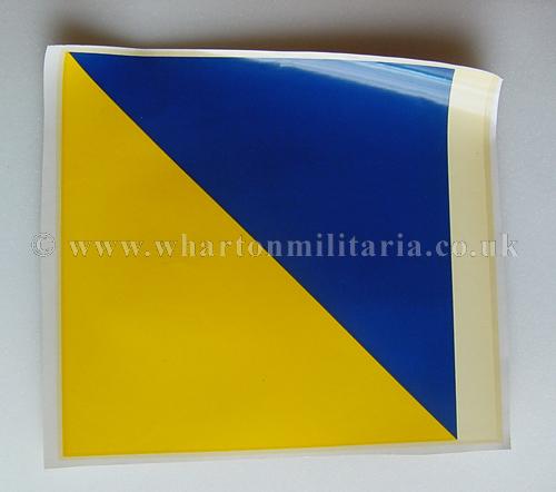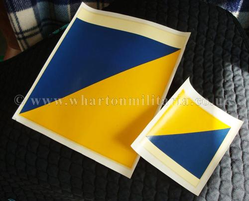 British Army Vehicle Decals 1950s-70s, blue on yellow diagonal on white bar, two sizes, 8x9.5 inches and 4.25x5 inches, water based decals, most likely of interest to vehicle collectors