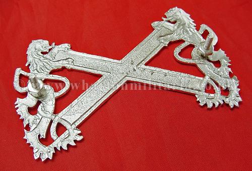 Scottish Regimental Piper cross belt plate in excellent condition retaining all its silver plate finish, all rear posts intact, approx size 3.5 x 2 inches, an impressive Scottish uniform item.
