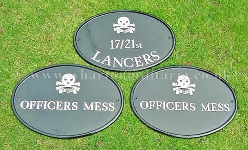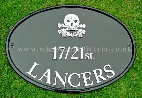 Three regimental wall plaques to the 17/21st Lancers, circ 1980s, powder coated background with hand painted motto and letters, nice interesting plaques, approx size about 18 inches across the front, fairly heavy and nicely made, price each.