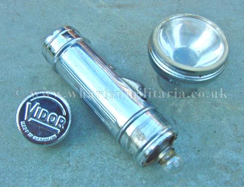 Wartime 'Vidor' pocket hand torch in excellent condition, no corrosion or loss of finish, approx size just over 4 inches in length, approx beam diameter at glass 1.5 inches, nice item for the vehicle folk or re-enactors.