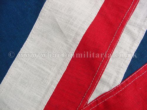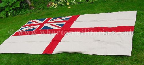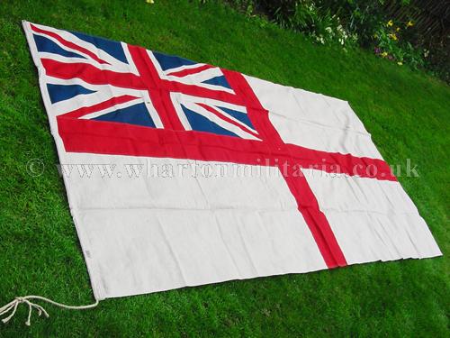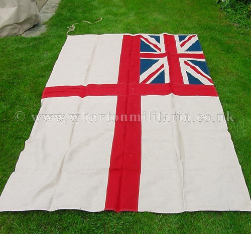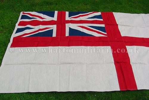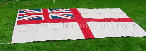 A very nice wartime British Royal Navy White Ensign flag, heavy linen multi-piece construction, 'WD' marked, approx 59 x 110 inches, in excellent clean condition overall, possibly unused, colours rich and unfaded, rope still attached, a nice period flag especially in such a large size.