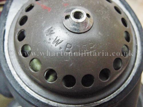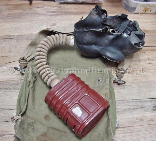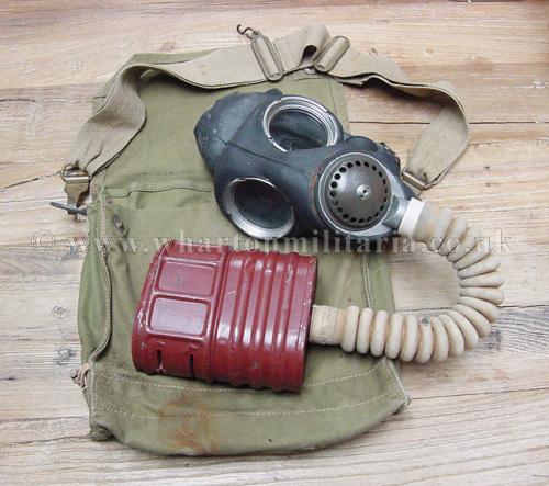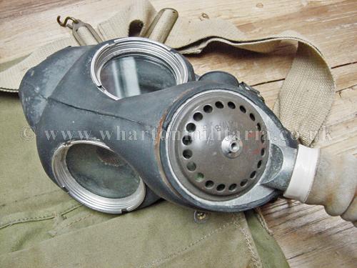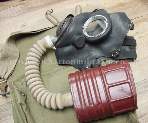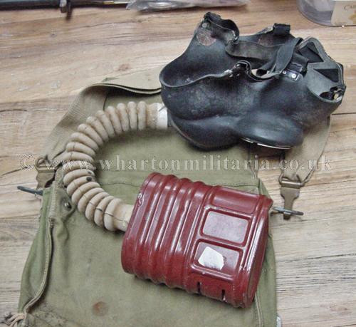 WW2 British General Service Respirator GSR 'Gas Mask' and Haversack in excellent overall condition, mask is dated March 1942 and maker marked 'URP', the breathing disc is also marked 'WWB Ltd' and dated 1939, the canister is marked 'AT B1/4/41' dated 1941. The haversack is in excellent condition and still retains the original string for securing the haversack to the wearer's chest when worn at the ready or alert. A fine early wartime respirator.