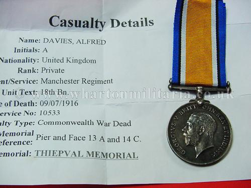 WW1 British War Medal to 10533 Pte. A. Davies Manch. R. Casualty, 3rd City Pals, killed 9th September 1916, first phase of the Somme, possibly Battle of Albert, Thiepval Memorial - medal in very good condition
