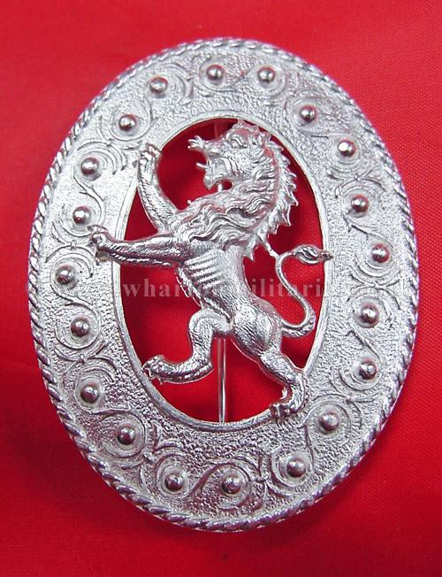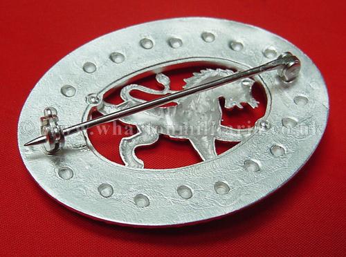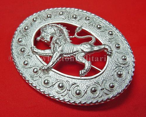Scottish medal or brooch, possibly a sash award or badge, in excellent condition retaining its frosted silver finish, has the lion mounted on a Celtic shield, size is approx 65x48 mm, I cannot see any hallmarks, it is non magnetic, quite heavy, lovely detail, obviously a well made quality item with a Scottish connection, maybe even a Regimental or Piper's piece.