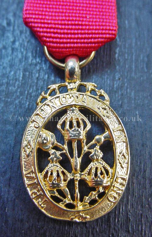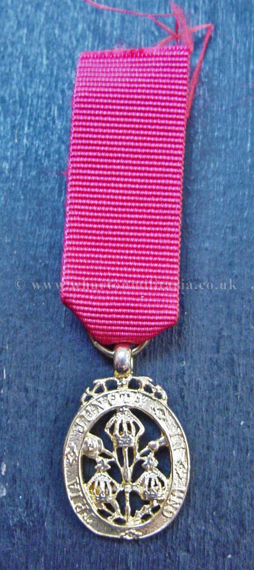 The Most Honourable Order of the Bath - Knight Grand Cross (GCB) Miniature sash badge, a scarce miniature for the order, these don't often come up, in excellent condition retaining its gilt finish and correct ribbon, a good opportunity for the collector of miniatures, this example is 26mm from the bottom to the top of the ring that the ribbon ring passes through, including the ribbon ring overall height is 36mm.