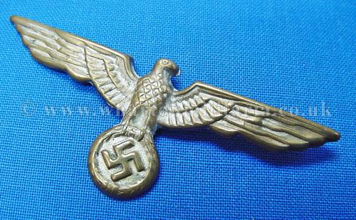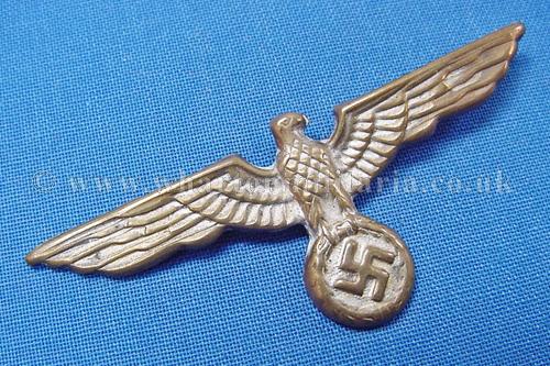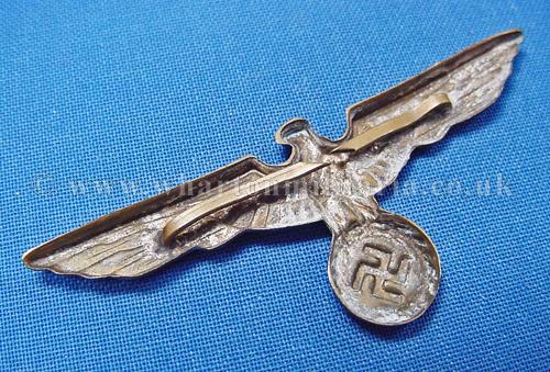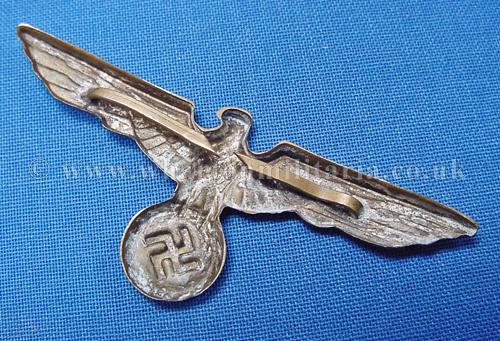 A scarce Kriegsmarine shore based administration officers cap eagle for the peaked cap, larger wingspan than the ratings cap eagle, excellent condition retaining much silver finish, both pins intact, a harder eagle to find these days.