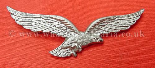 Luftwaffe cap eagle in good crisp condition by FLL and dated 1937, one pin remaining and sadly denazified, a nice early Luftwaffe eagle. Price reflects its condition.