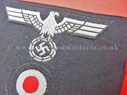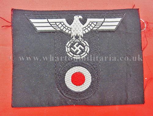 Wehrmacht Panzer cap eagle and roundle combination in excellent condition, machine woven, some paper marks to the rear from being fixed into an album at some time, a now extremely scarce cap eagle combination to find, nice example