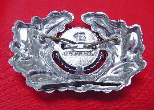 Wehrmacht cap eagle and cockade set, excellent condition retaining full finish, all pins intact, cockade marker marked '15' along with 'Ges Gesch' , a nice unused matching insignia set.