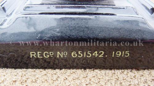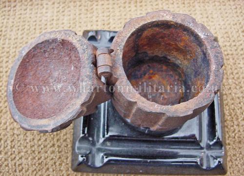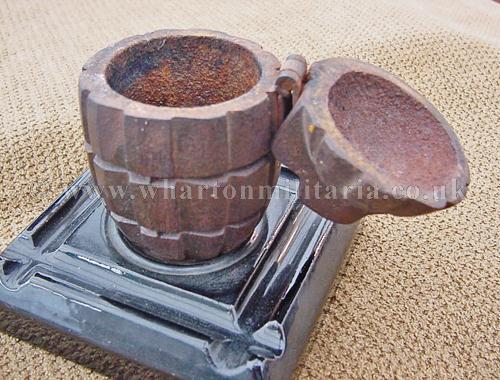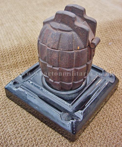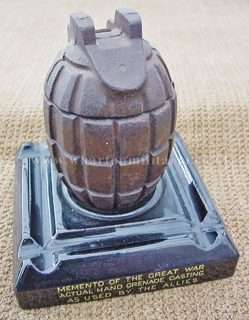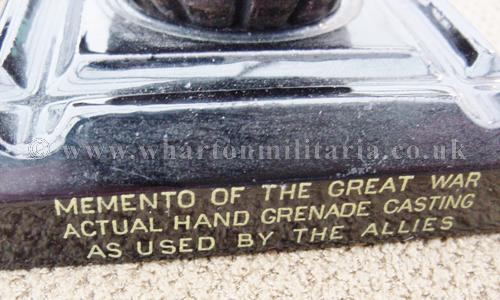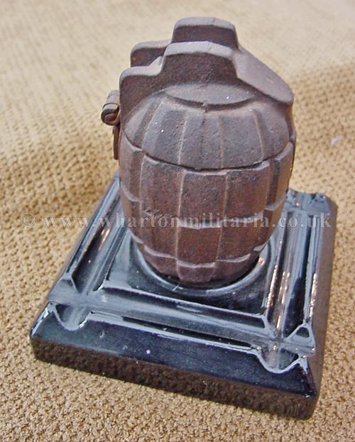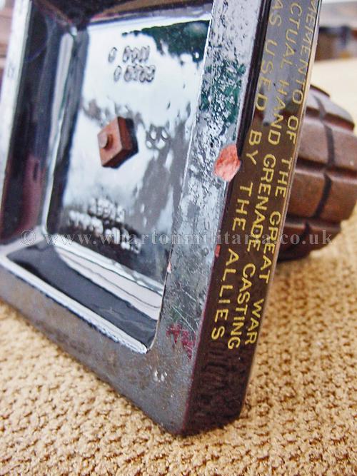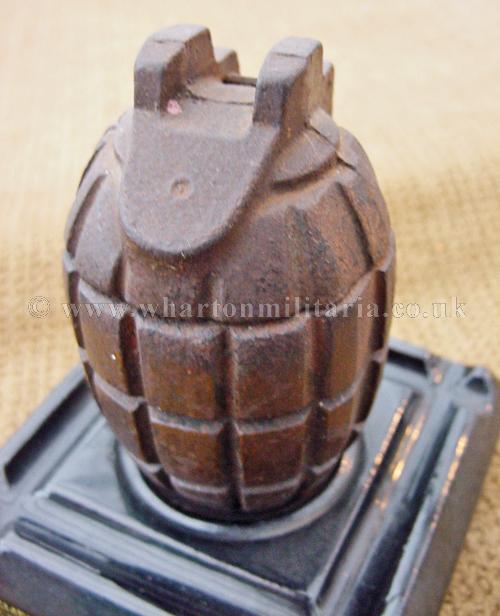 A very scarce surving WW1 grenade presentation piece of a mounted grenade casting, possibly a commercially made item or something produced by the Ministry, dated 1915, used as a presentation item possibly for manufacturers of grenades or general fund raising. In beautiful condition, minor chip on the underside of the base, a really interesting item showing a grenade body as it was cast by the foundry, top has been hinged to allow a look inside the body.