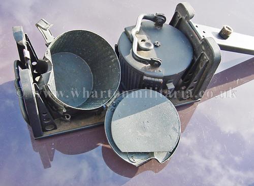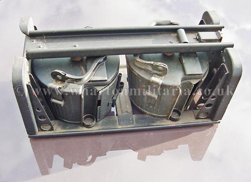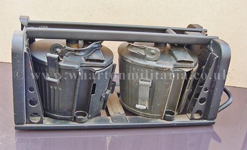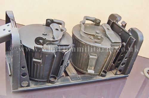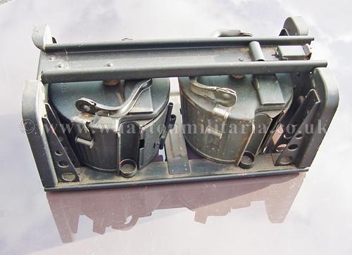 Original double ‘Gurttrommeltrager' carrying frame with two MG34 MG42 50 round belt drum magazines. Original Wehrmact with wartime paint finish, absolutely lovely condition, wartime manufactured dated 1943. Drums are maker marked 'Wa' and dated 1943 and 'Wa' - date covered. Drums clip onto the side of the MG34 and MG42. These are becoming hard to find these days, especially in wartime paint.