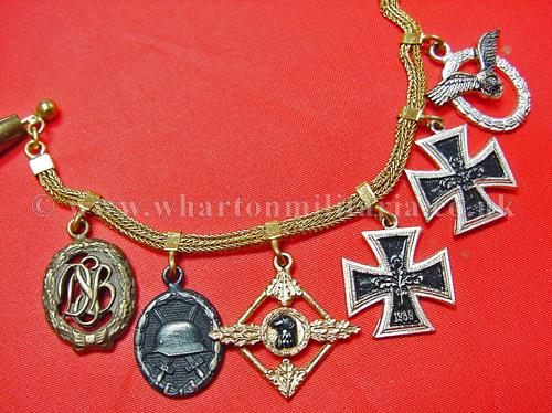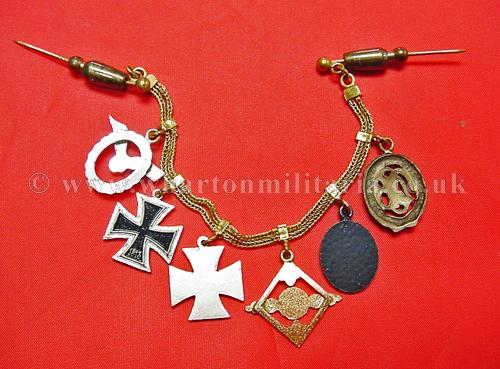 A scarce and difficult to acquire Luftwaffe Fighter Pilot's 1957 awards and honour chain, in excellent condition, chain has the Pilots badge, Iron Crosses - sometimes two ICs also denote the Knights Cross and the Iron Cross 1st class - Fighter clasp, wound badge and sports award, a very nice chain. Chains were popular with WW2 veterans and those that continued into the post war German armed forces. A most sought after item that is hardly found outside of Germany.