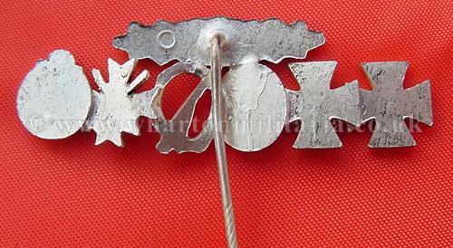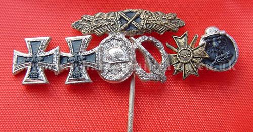 Stickpin 1957 8mm - Group of 7, Close Combat Clasp in Bronze, Iron Cross 1st & 2nd Class, Silver Wound Badge, Infantry Assault, War Merit with Swords and the Eastern Front Medal. A fine stickpin group of miniatures.