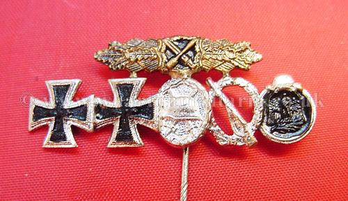 Stickpin 1957 8mm - Group of 6, Close Combat Clasp in Bronze, Iron Cross 1st & 2nd Class, Silver Wound Badge, Infantry Assault and the Eastern Front Medal. A fine stickpin group of miniatures.