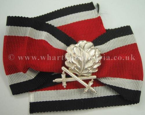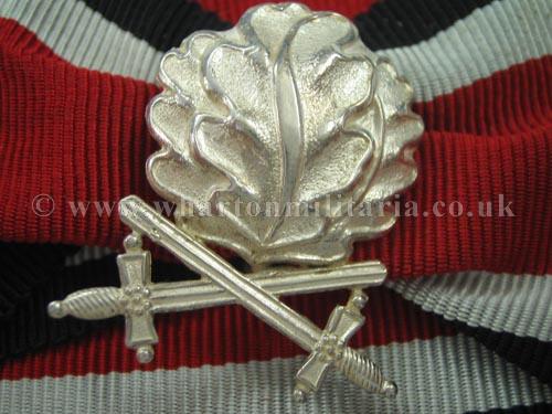 1957 Oakleaves with Swords mounted on a section of neck ribbon, most likely as a means of display rather than wear. Typical late 1960s piece, still retaining most finish. Nice set of oakleaves and swords.