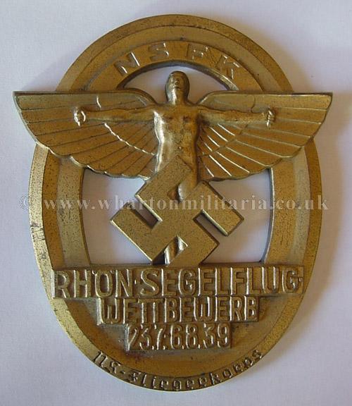 NSFK non-portable award -RHON-SEGELFLUG WETTBEWERB 23.7.-6.8.39 approx size 8 x 7 cm, large winged figure over swastika & script, bronze material, maker marked 'KIRCHEN'