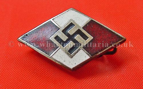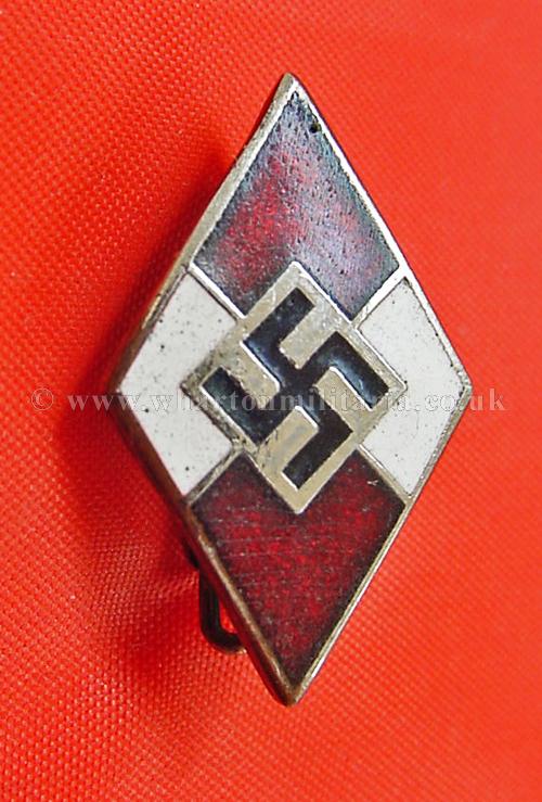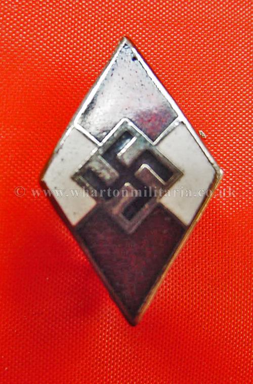 Hitler Youth members badge, in excellent undamaged condition, rich tone on the enamel, no damage though some discolouration and spotting on the white, some loss of finish to the rear, lovely example of an HJ members badge