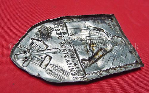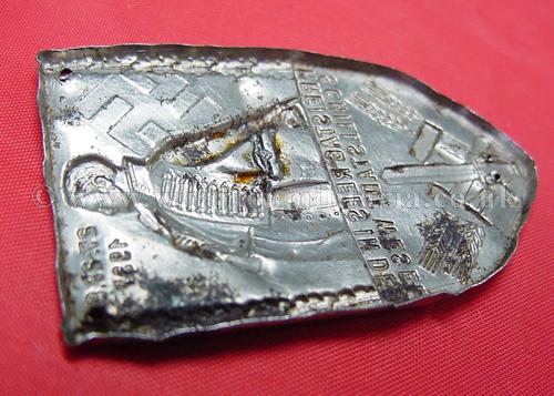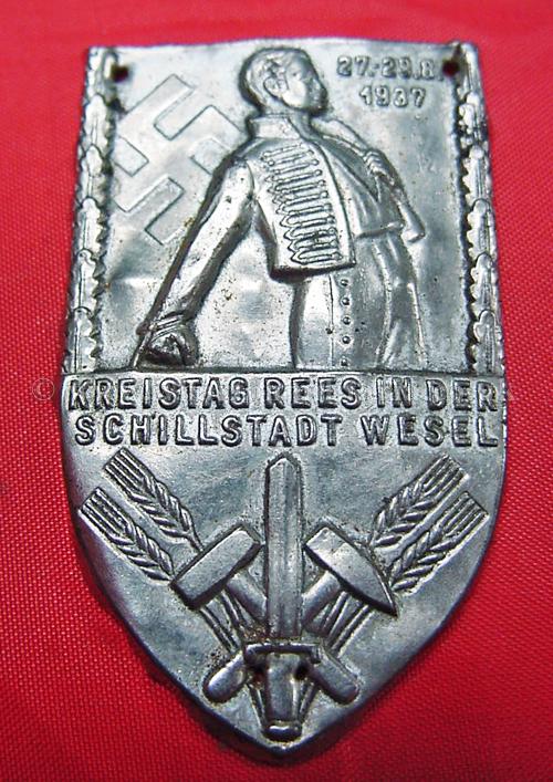 Day Badge - Kreistag Rees in Der Schillstadt Wesel 27-29 August 1937, approx size 52x32 mm, in very good condition, the pin has been removed as was fitted to a walking stick or pole through 4 tiny holes, top of each corner and either side of the sword hilt, a difficult to find day badge, priced to reflect the removed pin.