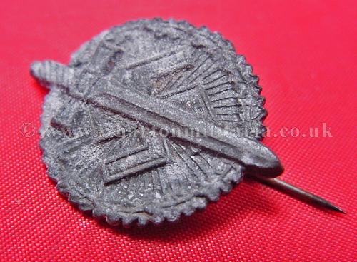 Day Badge - SA swastika and sword stickpin, down pointing sword over swastika, associated with SA events and gatherings, maker marked '28'