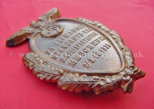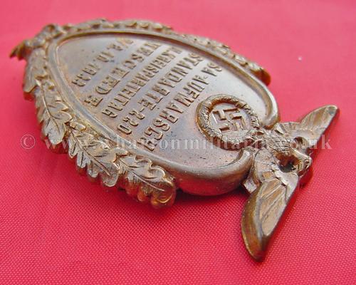 A scarce early SA Day Badge - SA Aufmarsch Standarte 220, Meschede 7-8th October 1933, in excellent condition, a nice early SA meeting badge the same size as the SA Treffen badge, heavy quality bronze metal retaining all its finish, these badges are especially hard to find.