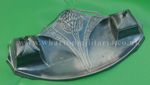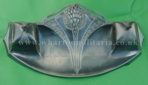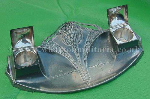 A really fine art nouveau pewter standish engraved to Squadron Sergeant Major C Ambrose, dated 13th September 1909, lovely design to the appearance, nicely marked on the base with registration and '325', a truely fine early piece. SSM Ambrose was a cavalry man, shown on the 9th Lancers 1913-1919 LSGC register, certainly worthy of more research.