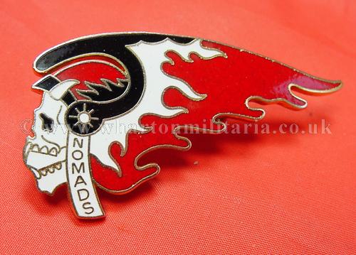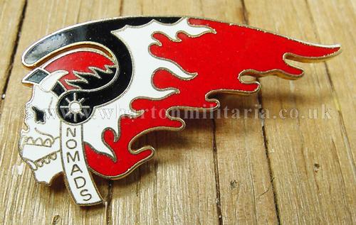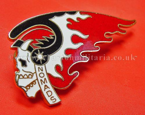 Nomads Motorcycle Club Deathshead badge, in excellent condition, no enamel damage and retaining both screw posts and nuts, approx 72mm long by 36mm high, lovely heavy quality badge, first one of these I've ever seen.