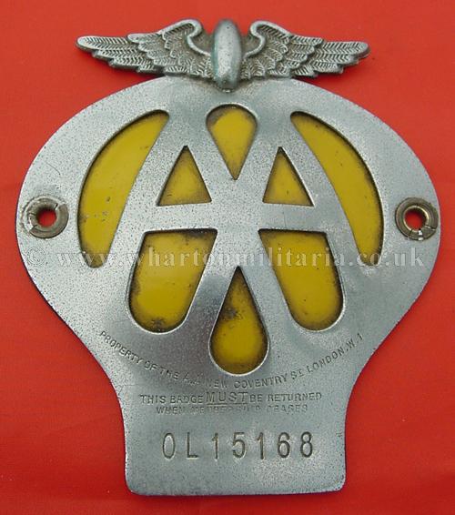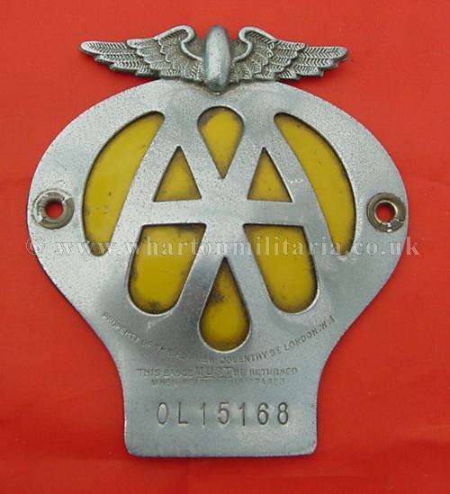 An excellent example of an early AA membership car badge, lovely condition, retaining the yellow backing plate which is still bright in colour. These car badges are becoming hard to find in such good clean condition.