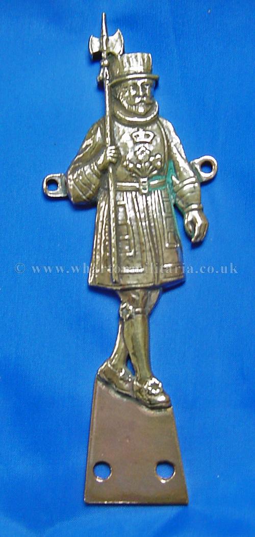 Vintage car badge of a Tower of London Beefeater, circ 1930s - beefeater has King's Crown on the chest, in excellent condition, approx size 145x50 mm, appears to be brass, quite heavy, 5mm thick, interesting old car badge.