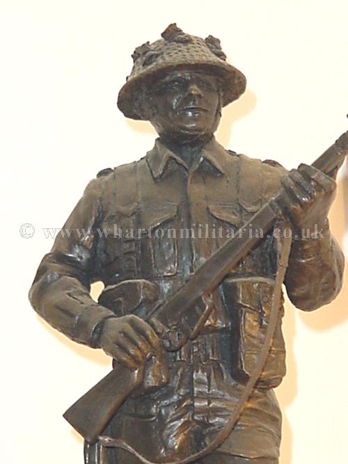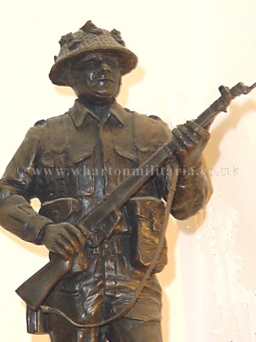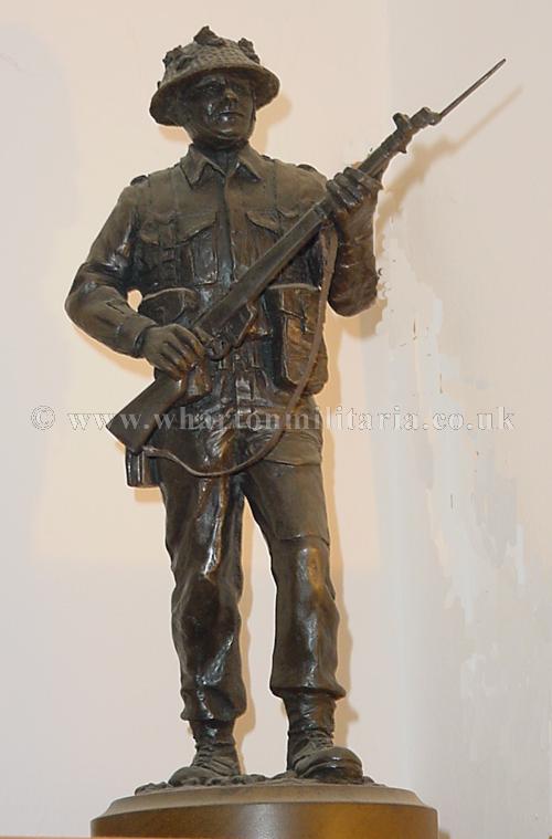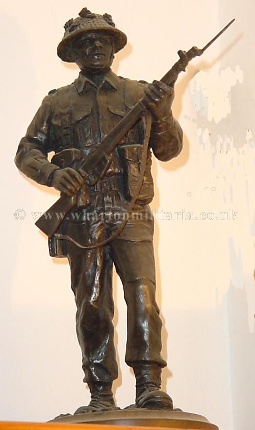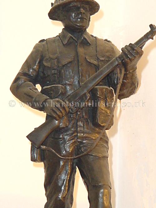 WW2 'Tommy' in battle order. Figure about 12 inches high on circular wooden plinth. Very impressive centre piece. The figure is made in the 'cold cast bronze resin' and was made by the noted Peter Hicks studio