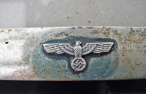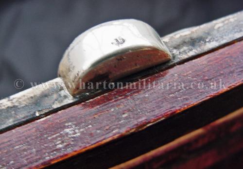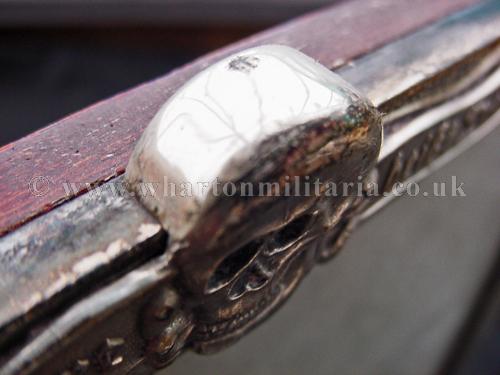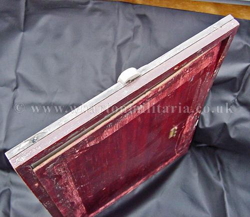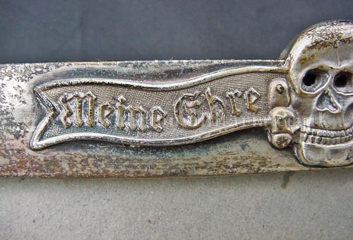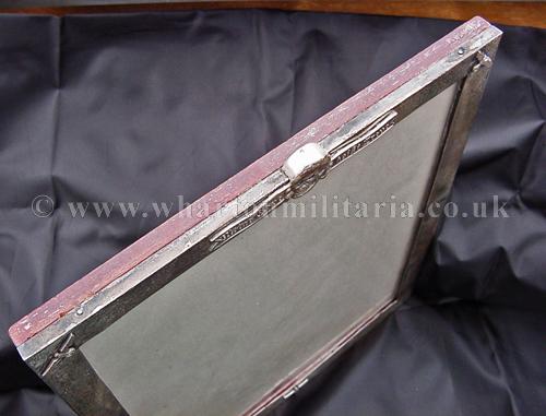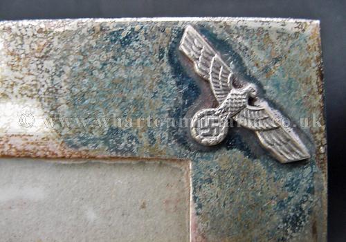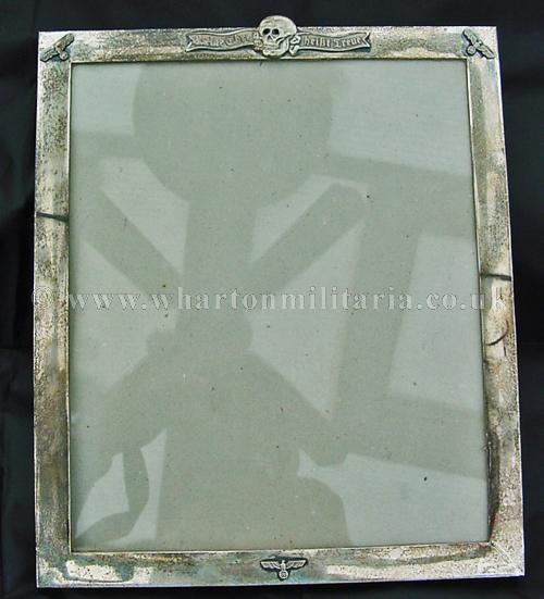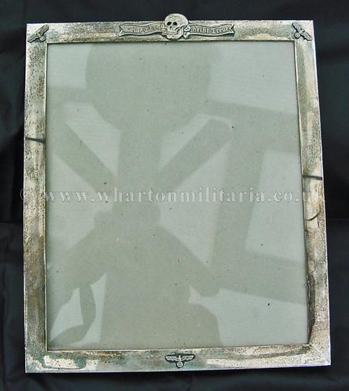 A very scarce German SS Officers solid silver (tested) photograph frame, with small eagles to the left and right upper corners and lower centre bottom and an honour deathshead skull in the top centre middle, in absolutely excellent condition, appropriate patina to a frame of this age, the backing board still present, the frame sizes are 30.5 x 26.3 cms external, viewable 'glazed' area 27 x 22.6 cm with the silver frame border being about 18mm wide. Backing board has remains of the stand assembly, broken at some point in its history, could be a replacement though is contemporary, very typical of art deco frames of that period across Europe as a whole. There is a lot of silver in its construction. An extremely rare and desirable item for the SS Collector.