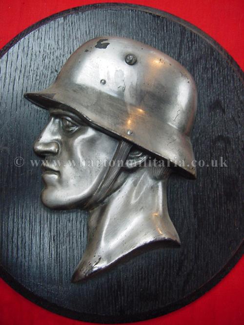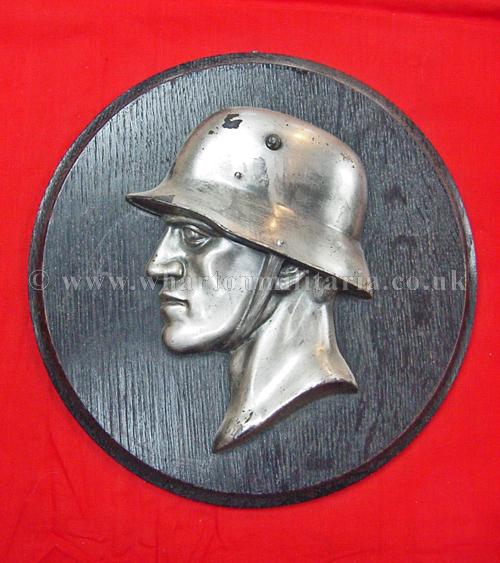 Third Reich period award plaque for military service, in excellent condition overall, nice patina, approx size is 8 inch / 20 cm diameter, shows a soldiers helmeted head and shoulders, a nice period plaque.