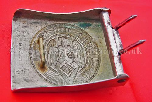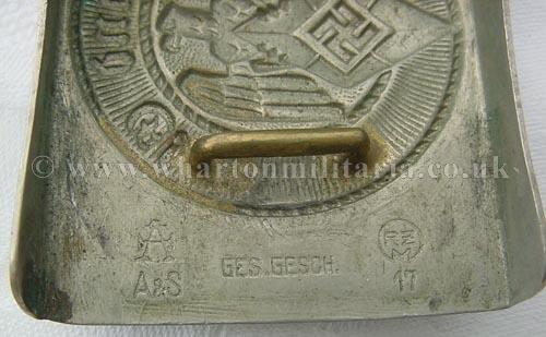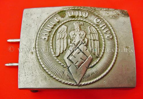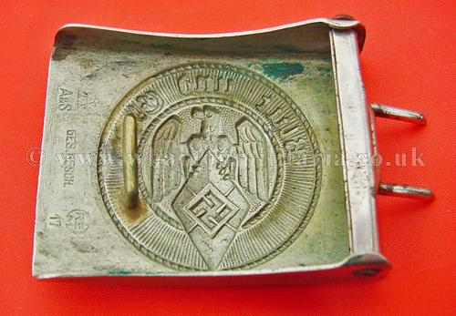 HJ nickled steel buckle, with almost no wear retaining good crisp detail to eagle and centre piece. Buckle is marked Ges. Gesch. A&S RZM 17, still on its original belt, belt is marked and dated 1943 plus has other marked numbers. A nice HJ buckle with a belt reflecting the variable waist size of its wearer during the war