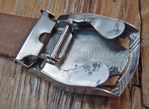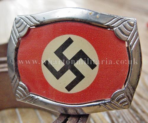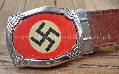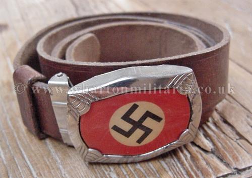 Very early HJ belt and buckle, NSDAP Youth belt and buckle used prior to the standardisation of the HJ buckle design, with almost no wear retaining good crisp swastika centre piece. Buckle is marked 'DRGM'. Belt is brown leather, approx. 82cm long, and has a period repair to the middle - see images. A very nice example of an early HJ belt and buckle.