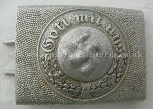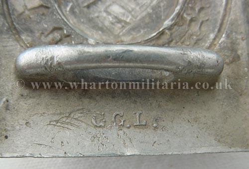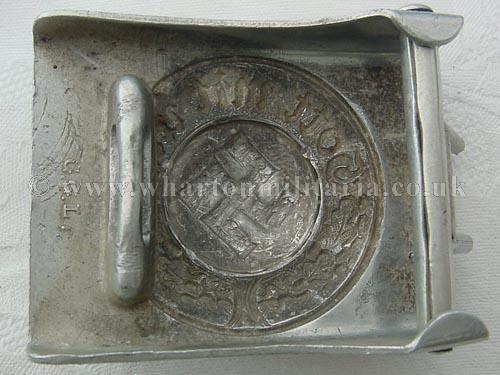 Police alloy buckle, good condition overall, however it has had some damage to the swastika in the past, possibly an attempt at de-nazification, as it appears that the swastika has been punched 'out' into a visually fuller position. Buckle maker marked GGL.
