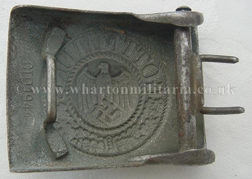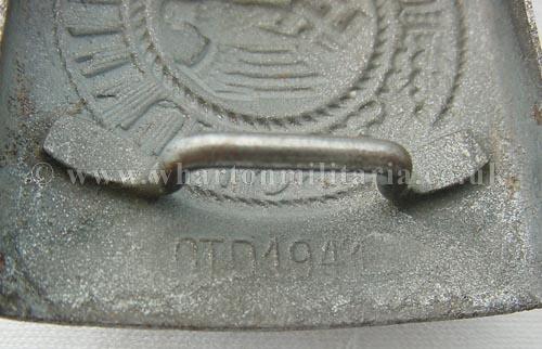 Wehrmacht steel buckle, some minor wear to front of buckle, the swastika has been carefully rubbed back (denazified) otherwise not a bad example. Buckle is stamped 'OTO1944'.