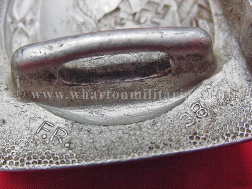 Luftwaffe alloy belt buckle in very good condition retaining good detail to buckle frontage, usual wear to the highlights, lovely patina, prongs have been broken off though could be easily replaced. Buckle is marked 'F.R. 38'. A nice early Luftwaffe belt buckle. Price reflects the prongs.
